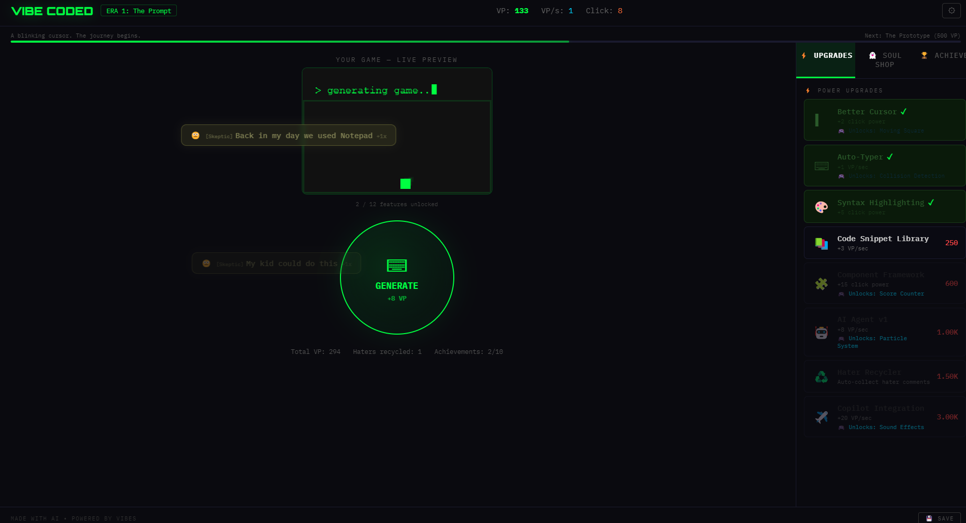 - Tiered Hater System — Skeptics, Haters, and Ragers spawn with 80+ unique snarky quotes. Click them for bonus VP!