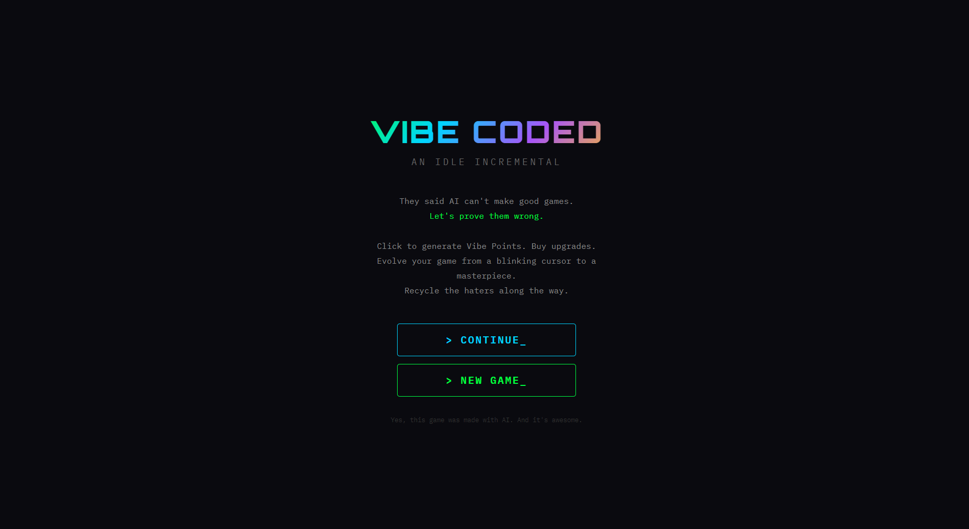 Start with a blinking cursor and evolve your AI-generated game from a basic prototype to a viral masterpiece — all while fending off waves of internet haters who think AI can't make real games.